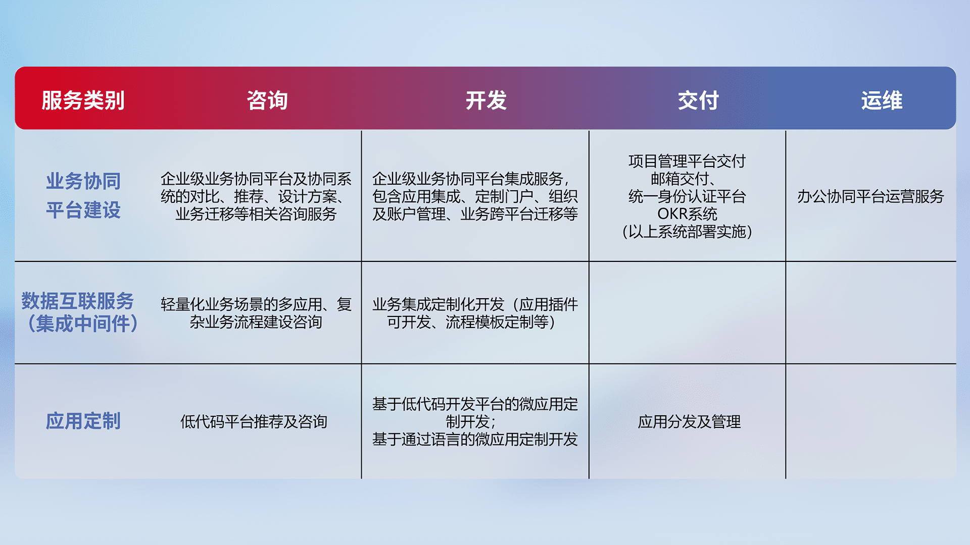 针对钉钉、、、、企微、、、IDaas等平台级产品提供产品的规划、、、、方案、、、、交付、、定制化开发等服务,,,,实现如统一协同办公、、、智能客户服务、、、、混合会议管理、、、、智能数据查询、、、等业务场景,,,,实现数字化转型。。。
