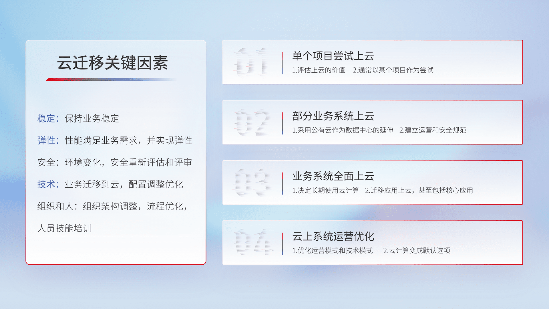 结合实际业务,,,从规划设计、、云平台选型、、、云原生改造、、、、数据迁移、、集成交付,,迁移全过程为客户识别最佳上云路径,,做好风险识别管理,,,设计网络架构、、、、身份权限、、安全审计合规、、、、操作审计、、日志审计、、、、监控告警策略、、、多站点容灾设计等,,对云上基础设施进行整体规划,,提升IT治理水平,,以满足弹性、、、、高可用、、高性能的需求。。。。