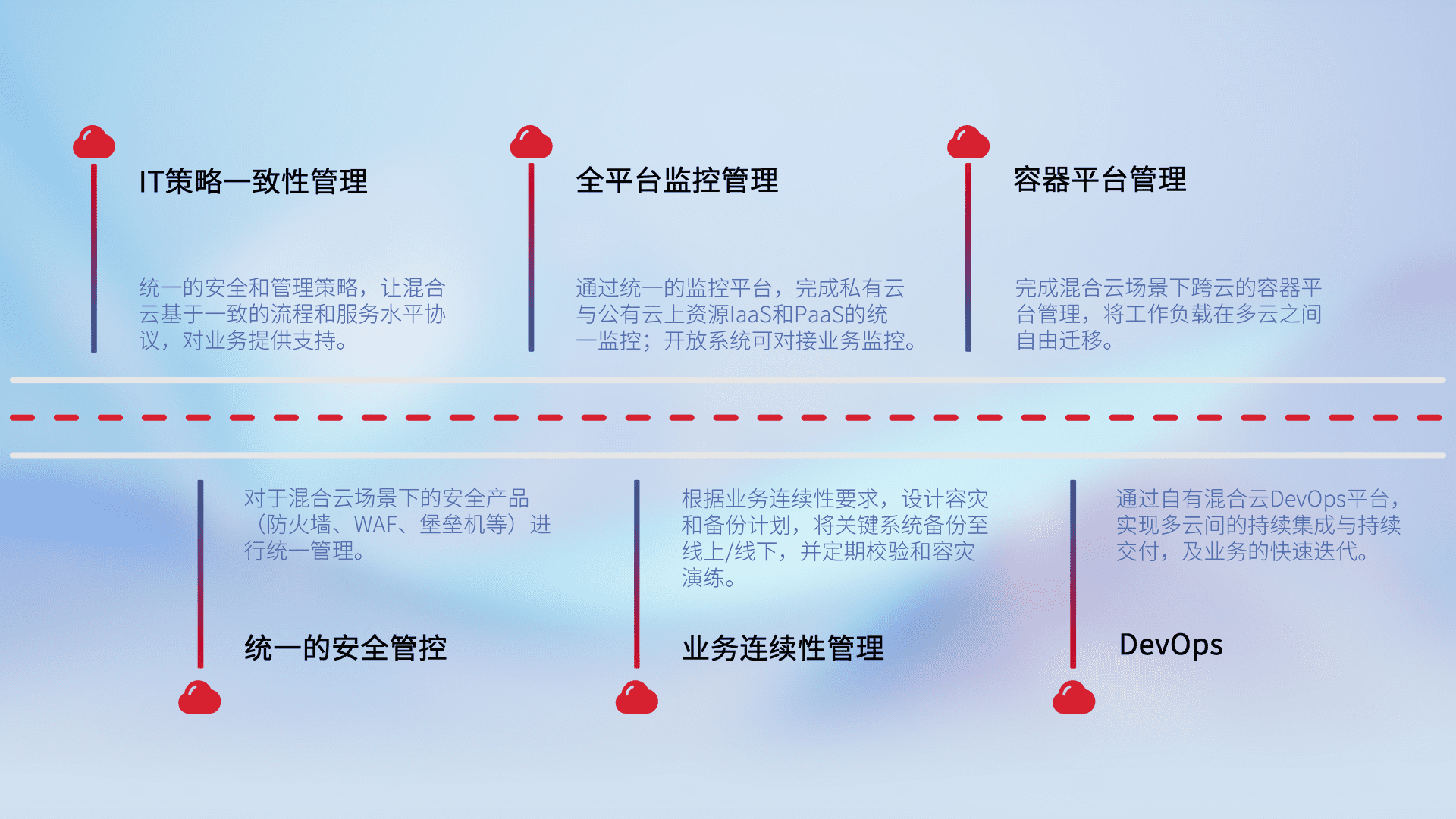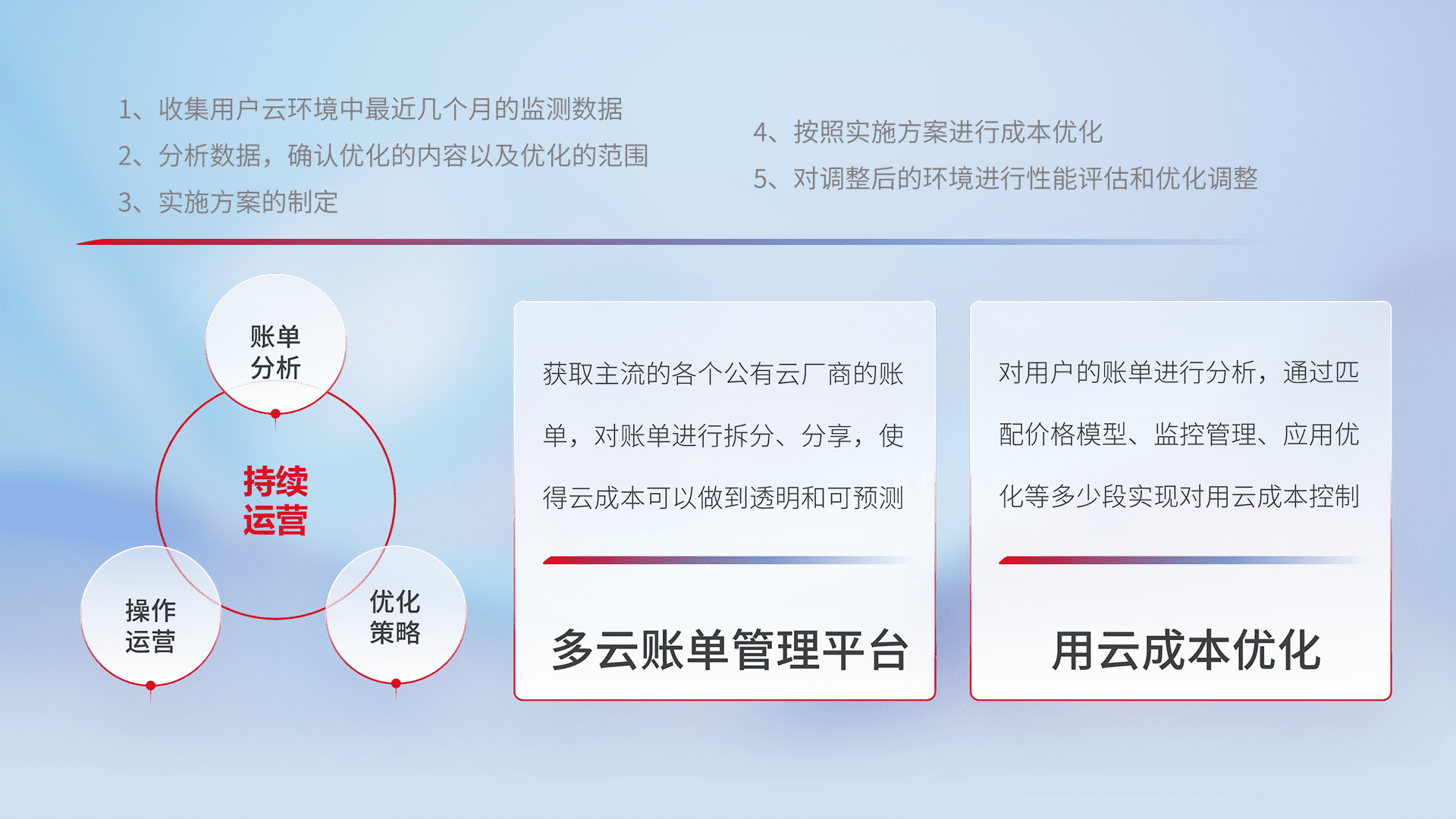 通过多云纳管,,以统一的资源数据模型把客户的云资源进行抽象和封装,,进而实现对多云资源的统一操作,,保障云资源管理的可靠性、、、稳定性与可用性。。。。量身定制化运维内容,,,,配置、、、开发运维、、、补丁管理、、、备份、、、、监控、、、认证和访问管理、、、、审计和日常巡检等,,,保障在用云过程中的可靠度,,,,稳定度以及高可用率。。。